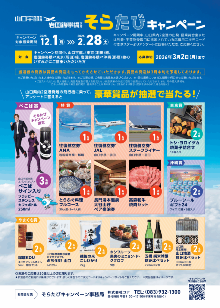 本キャンペーンは、山口県内2空港を利用されたお客様を対象に、アンケートに回答すると山口の魅力あふれる特産品などが抽選で当たる企画として実施されたものです。